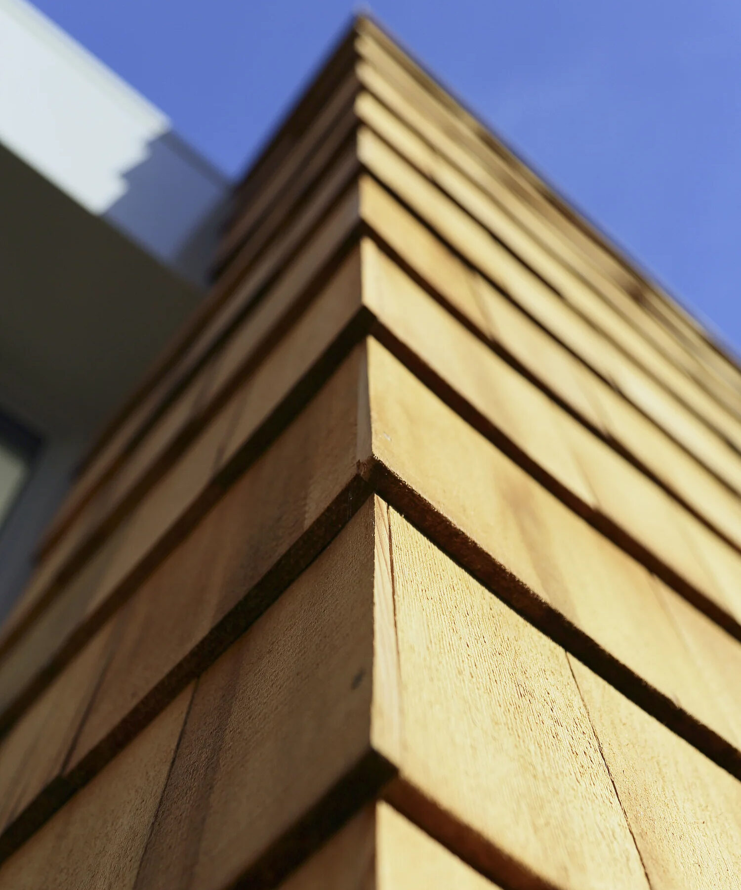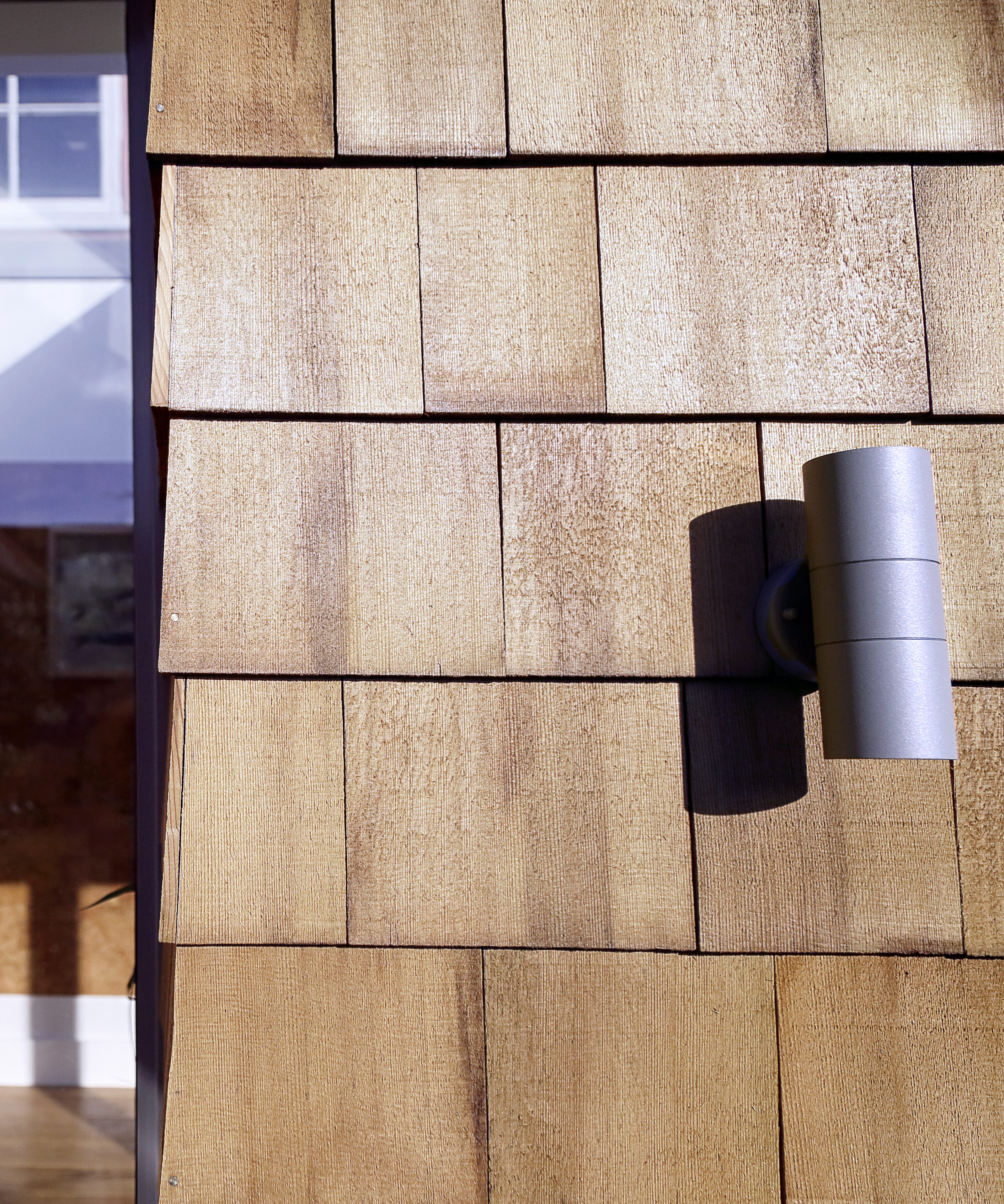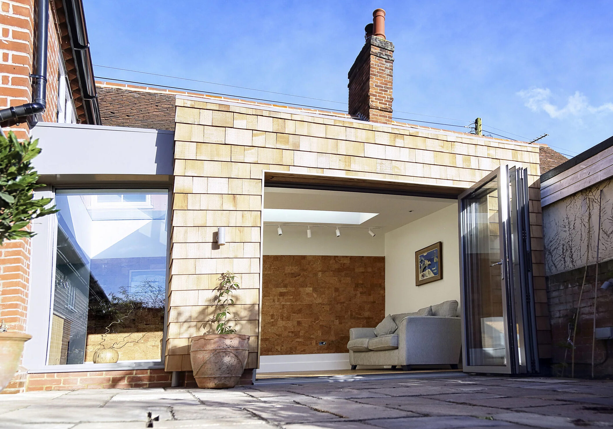 Internal and external finishes consolidate the connection between the new room and courtyard garden. Natural cork internal wall covering and oak floor have a strong visual correlation with the texture and tone of the external cedar shingles. The room enjoys step-free access to the soft sandstone surface outside and is finished with a sedum green-roof visible from bedrooms above.