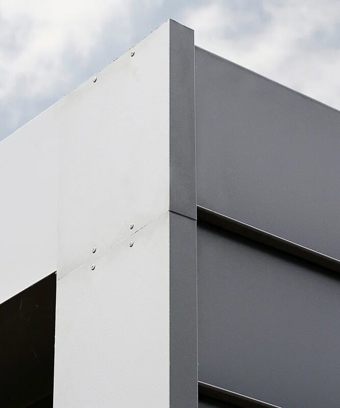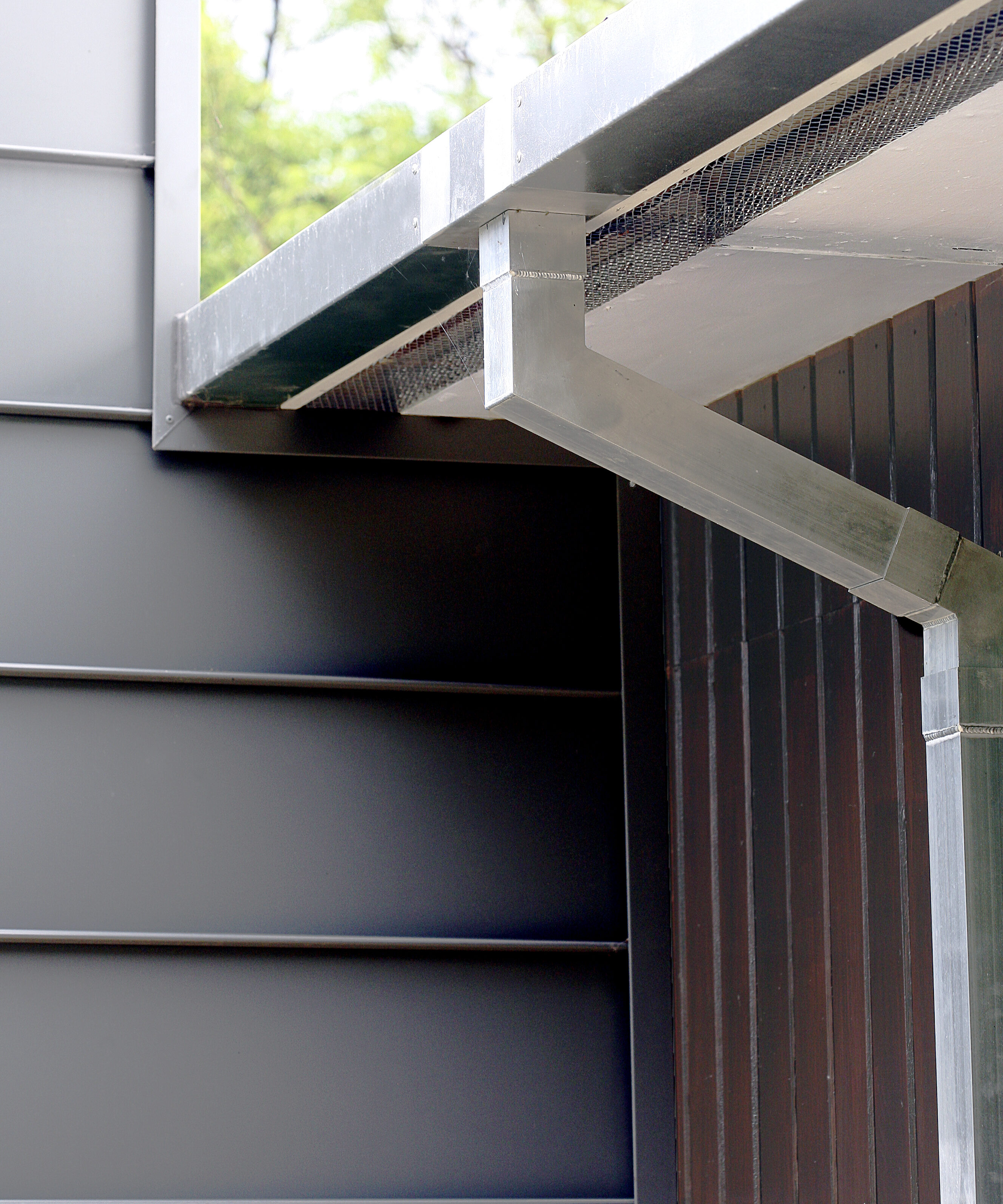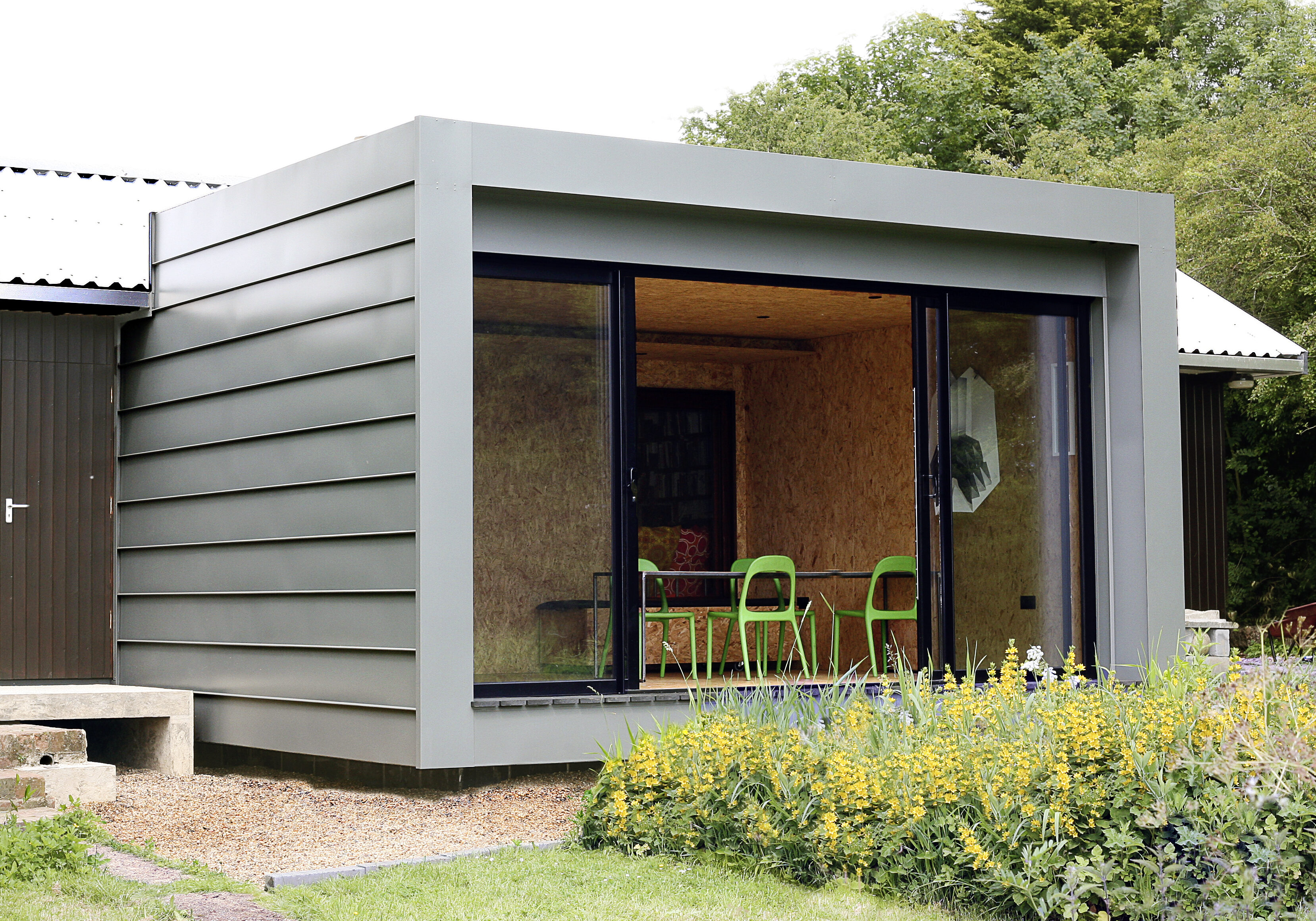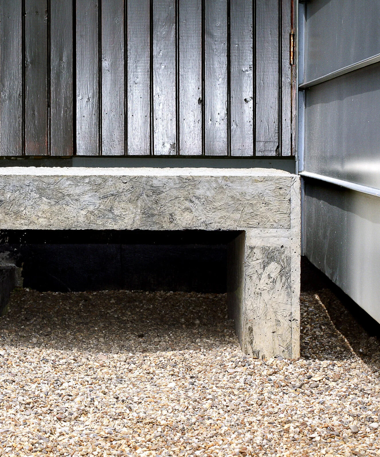 Maintaining the experimental dwelling’s environmental legacy, a palette of materials was selected and sourced from UK manufacturers to reduce additional finishing processes and long-term maintenance including shuttered concrete rear entrance steps; standing seam external metal roof and wall cladding; mill finished aluminium guttering; and a unifying OSB (oriented strand boarding) internal finish with expressed fixings.