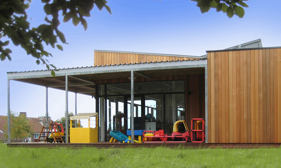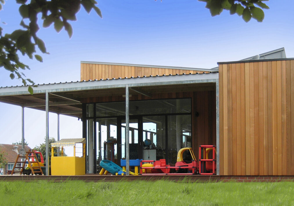 Externally, the interlocking forms of the building are primary and playful. A generous covered external play area maximises year-round outdoor play opportunity whilst protecting south-facing glazing from overheating. The open plan interior is welcoming, allows flexibility and enables easy oversight.