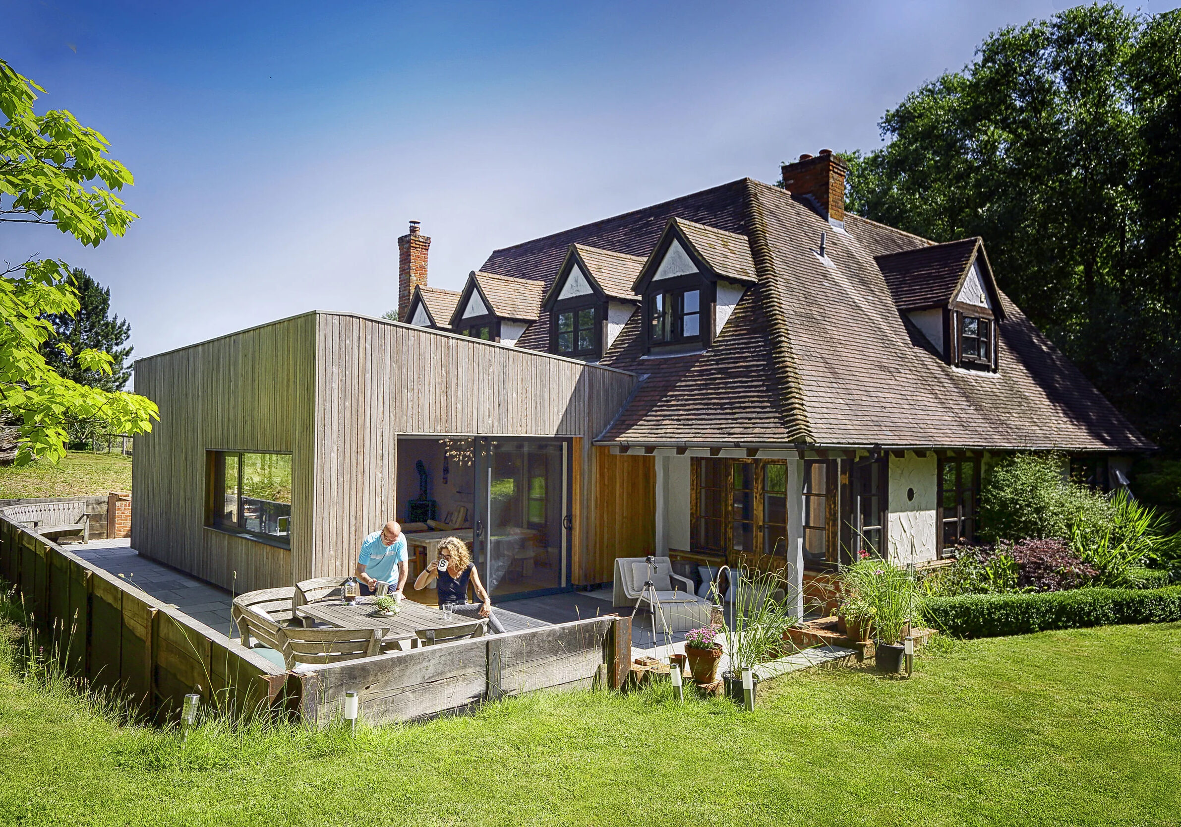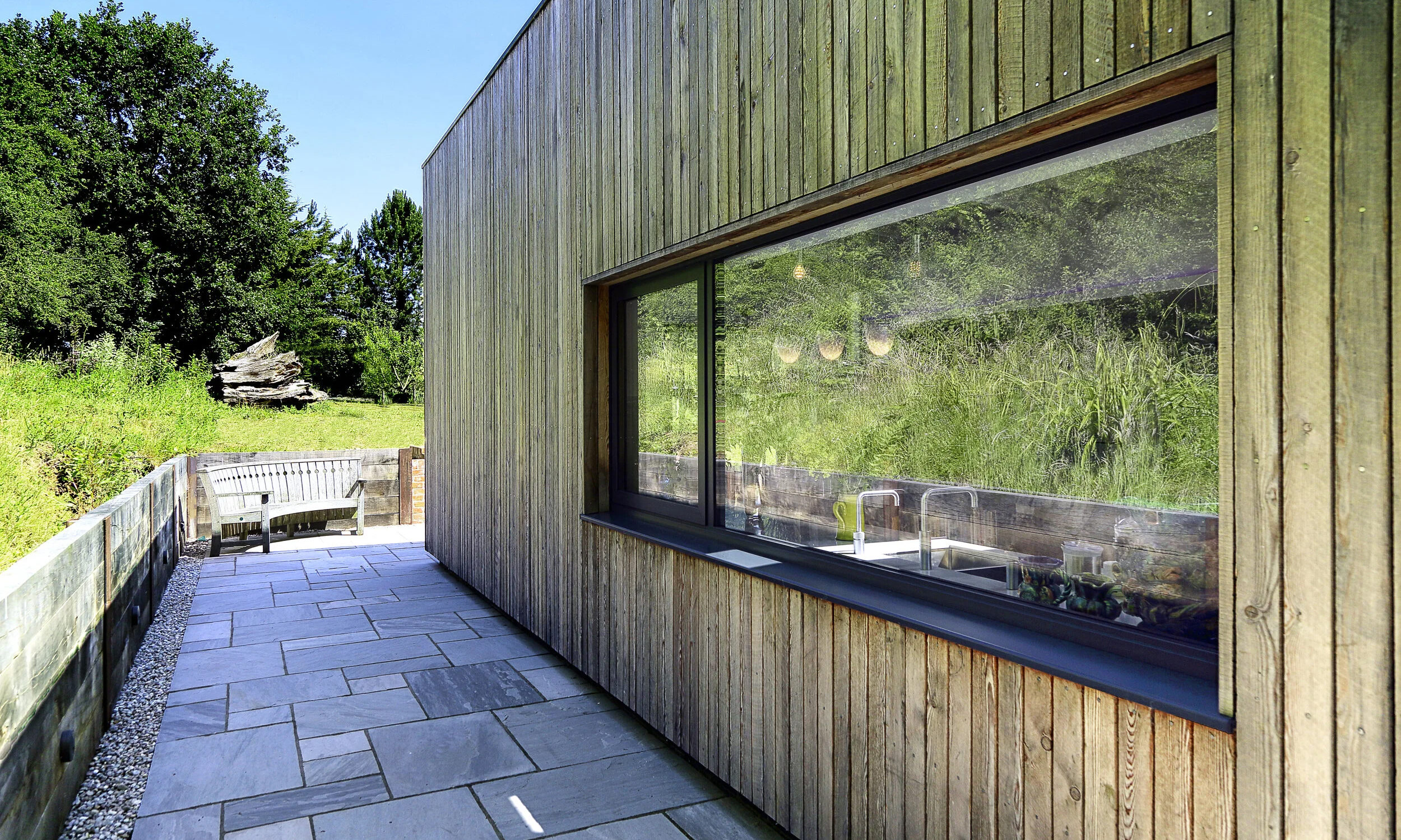 Externally, the roof form and composition of windows are kept simple to sit gently in relation to the business of the original home and rough sawn Siberian Larch cladding responds to the woodland setting.