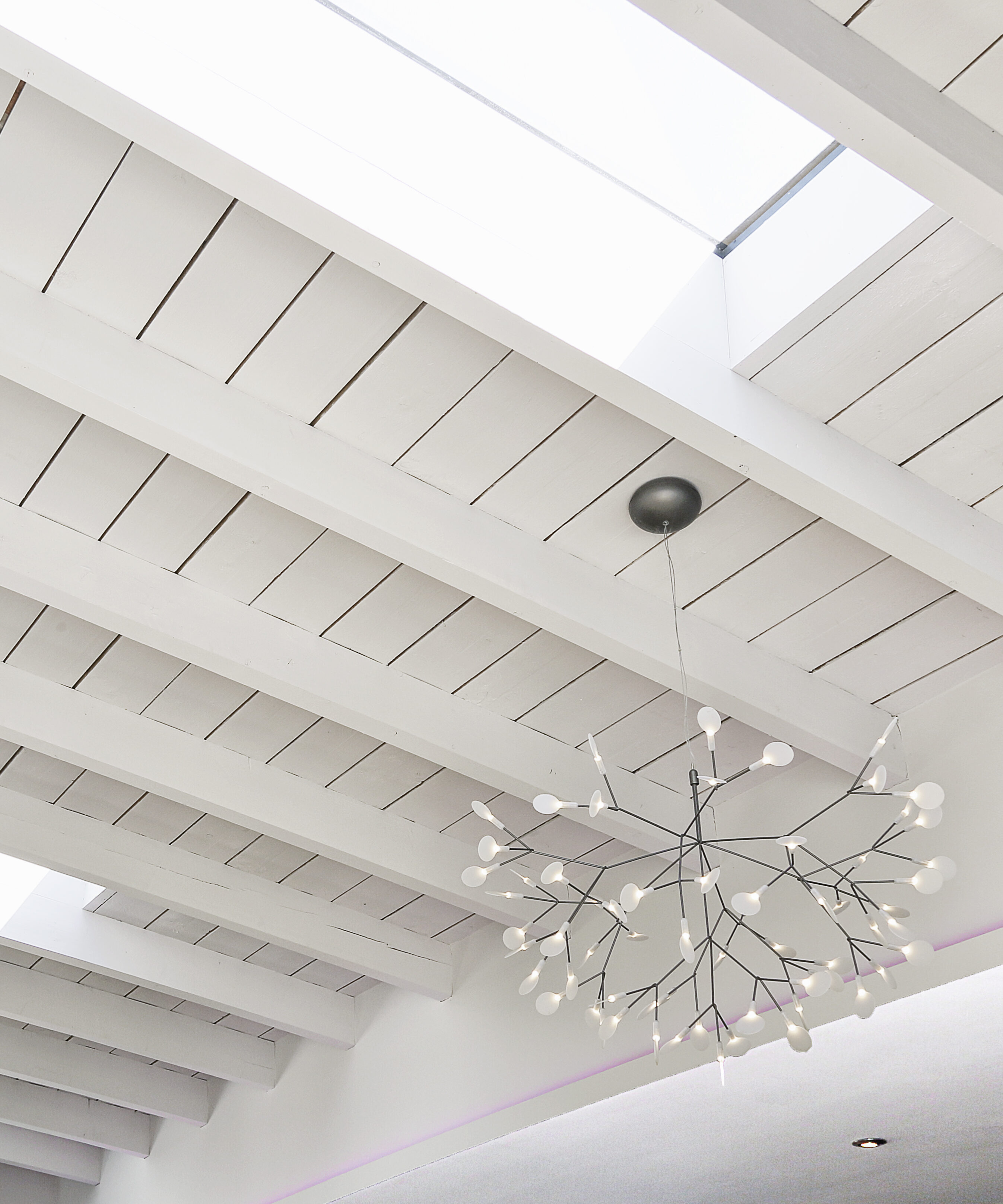 The project is an expansive cabin-like space with a series of slot rooflights providing daylight from above.  The painted ceiling of rough sawn timber boards over exposed rafters maximises light reflection in the high space and creates texture and depth which resonates with the natural foliage outside.  Strong horizontal glazing to the extension helps stretch the space outward into the landscape.